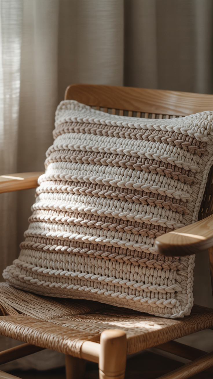 Dieses Kissen bringt Struktur in den Raum. Die klaren Linien wirken modern und ruhig. Mit einer Pastellpalette bleibt es dezent und passt in viele Wohnstile.