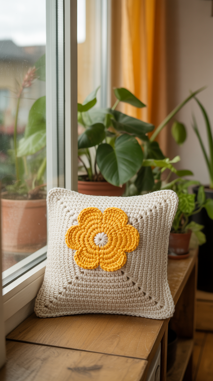 Eine einzelne Blume schafft einen Akzent auf schlichter Fläche. Du häkelst die Applikation separat und nähst sie dann auf. So bleibt das Kissen schlicht und doch verspielt.