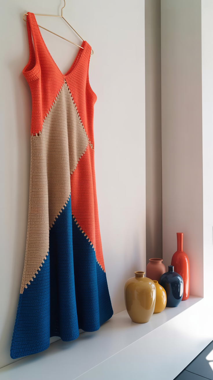 Spiele mit Farbkontrasten in jedem Quadrat. Für den Abschluss kannst du eine Spitzenkante ansetzen. Ein schmaler Riemen an der Taille betont die Silhouette zusätzlich.