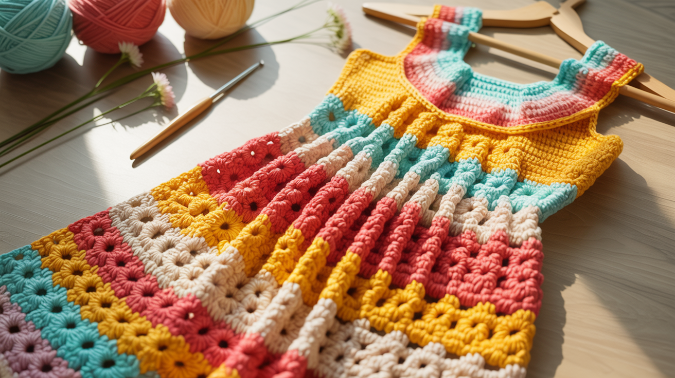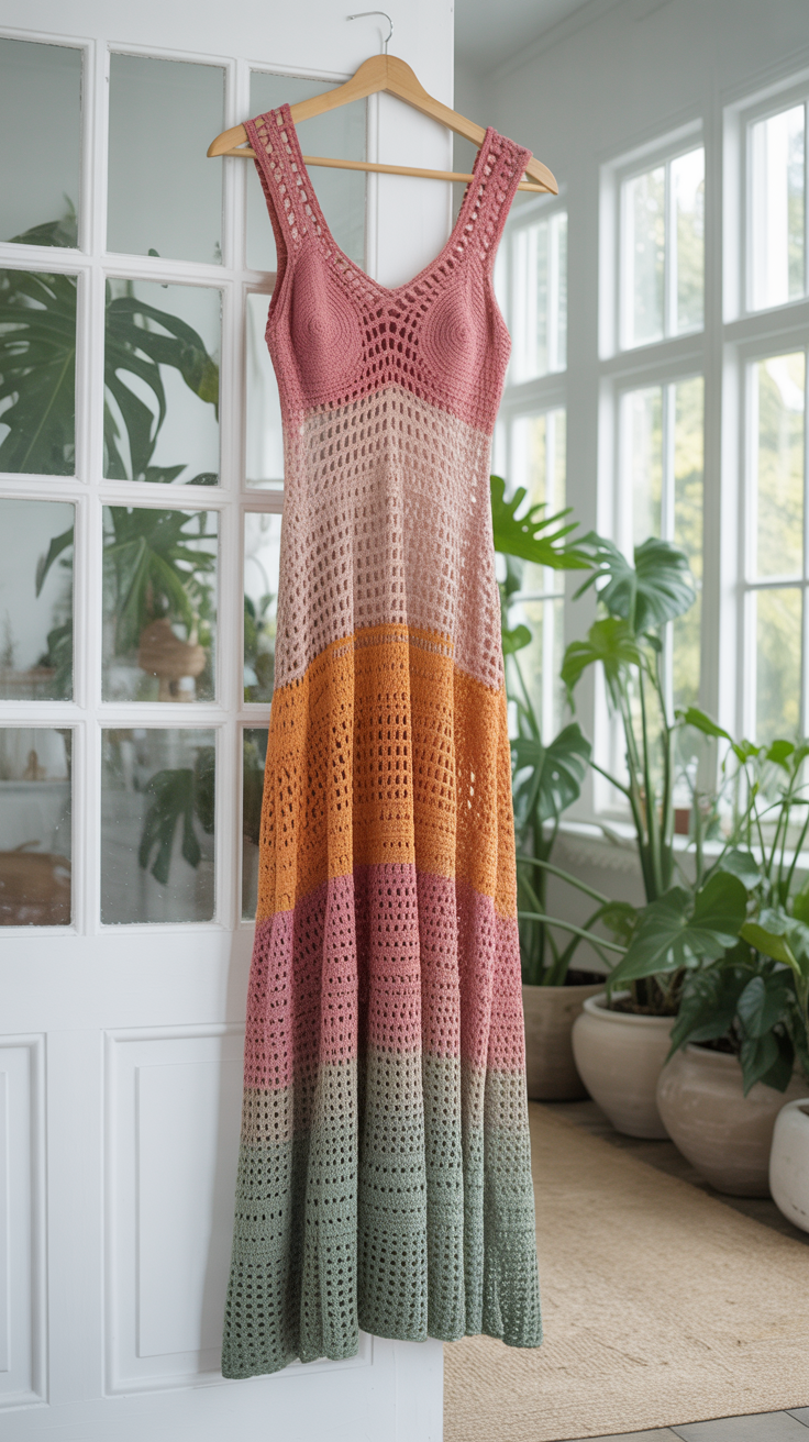 Der Farbverlauf verleiht dem Kleid Tiefe und einen sanften Übergang. Diese Technik lässt sich mit Spezialschnüren oder handgefärbten Garnen umsetzen. Ein pastelliger Verlauf passt gut zu leichten Sommertagen.