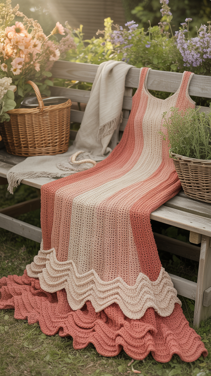 Ein offener Schulterbereich schafft ein elegantes Detail. Das Wellenmuster im Rock erinnert an sanfte Meeresbewegungen. Es eignet sich besonders für gehäkelte Freizeitkleider.