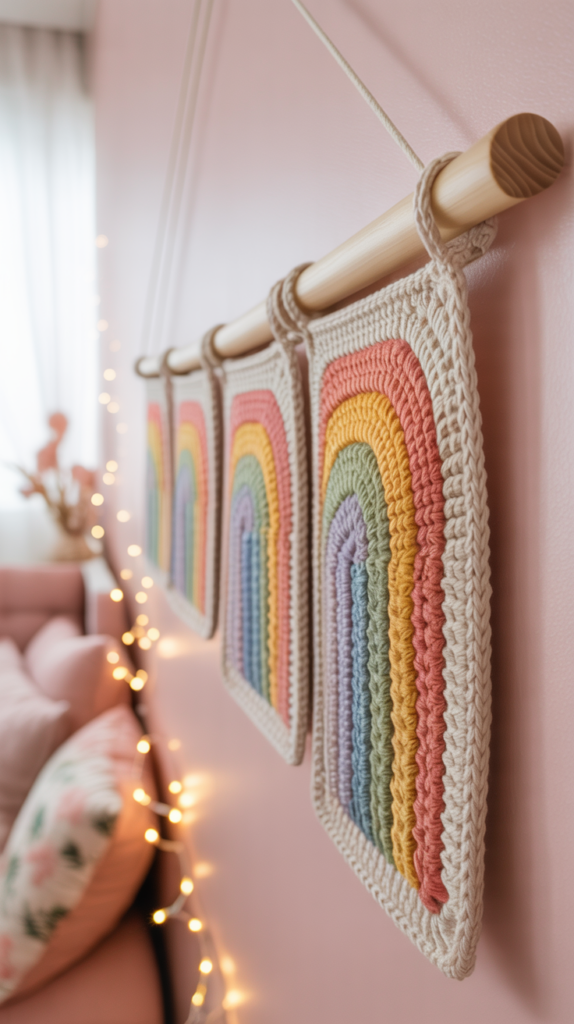 Ein dekorativer Wandbehang mit Regenbogenstirnseiten bringt Fröhlichkeit ins Kinderzimmer. Er hängt flach an der Wand und verändert das Raumgefühl. Oft ergänzt er eine Lichterkette.