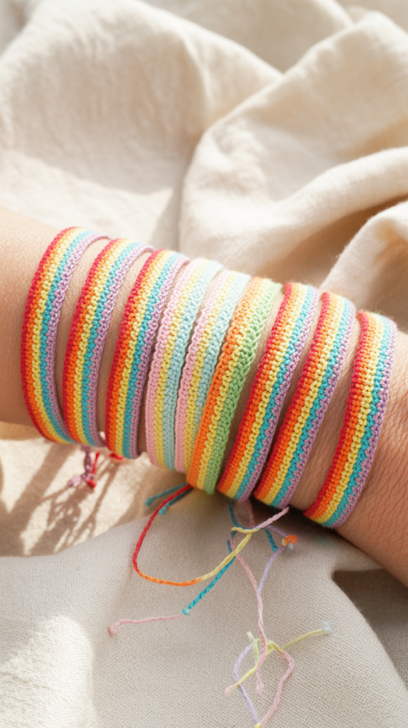 Ein Häkelarmband mit Regenbogenbändern ist ein unkompliziertes Schmuckstück. Es passt sich dem Handgelenk an und setzt farbenfrohe Akzente. Der Verschluss erfolgt flexibel mit einem Knoten.