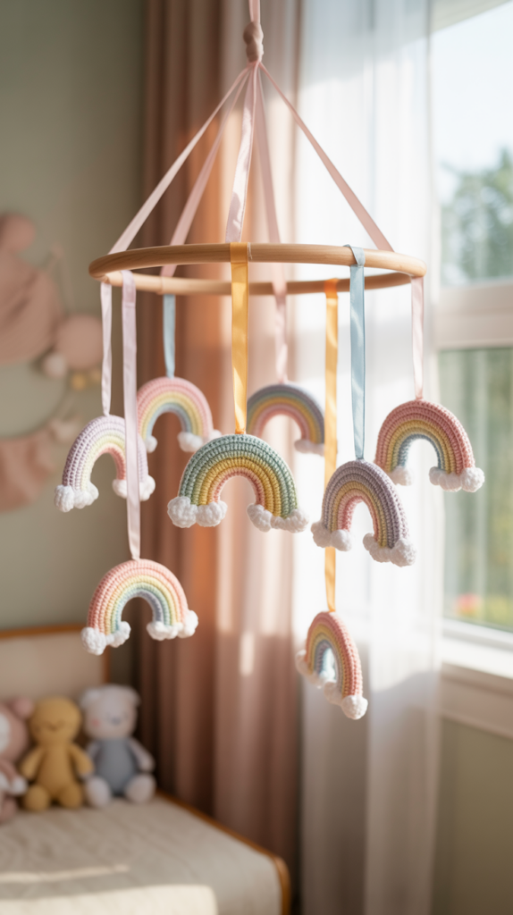 Ein Mobile mit kleinen Regenbögen wirkt luftig und farbenfroh. Es eignet sich gut über dem Wickeltisch oder im Fenster. Durch die Leichtigkeit bauschen sich die Bögen sanft im Luftzug.