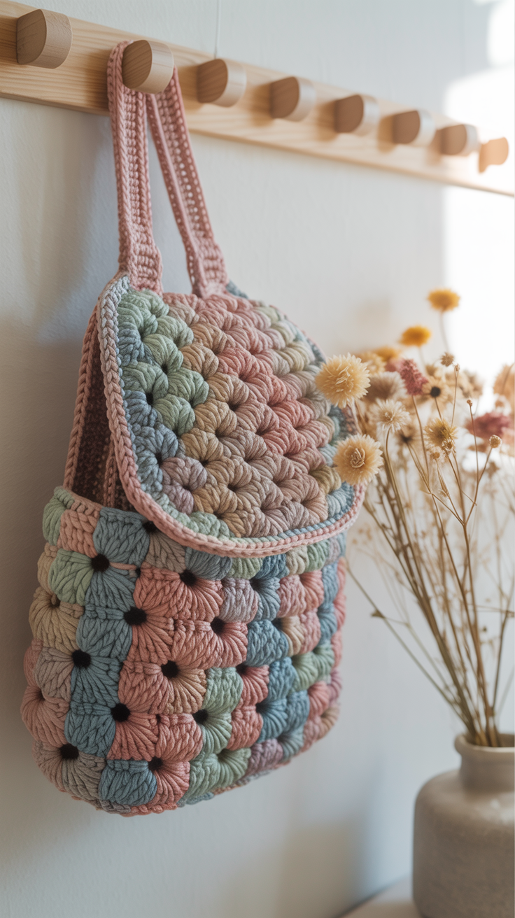 Die Muscheln verleihen dem Rucksack eine weiche Struktur und leichte Wellen. Dieses Modell eignet sich gut für Frühlingsfarben. Du kannst das Muster in Reihen arbeiten und den Rucksack nach unten hin verbreitern.