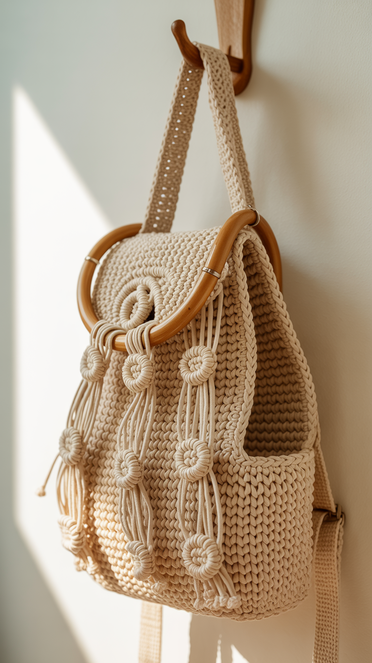 Macramé-Knoten lockern die Optik auf und geben dem Rucksack eine handgemachte Note. Ich kombiniere ein schlichtes Häkelmaterial mit Knoten an der Vorderseite oder an den Trägern.