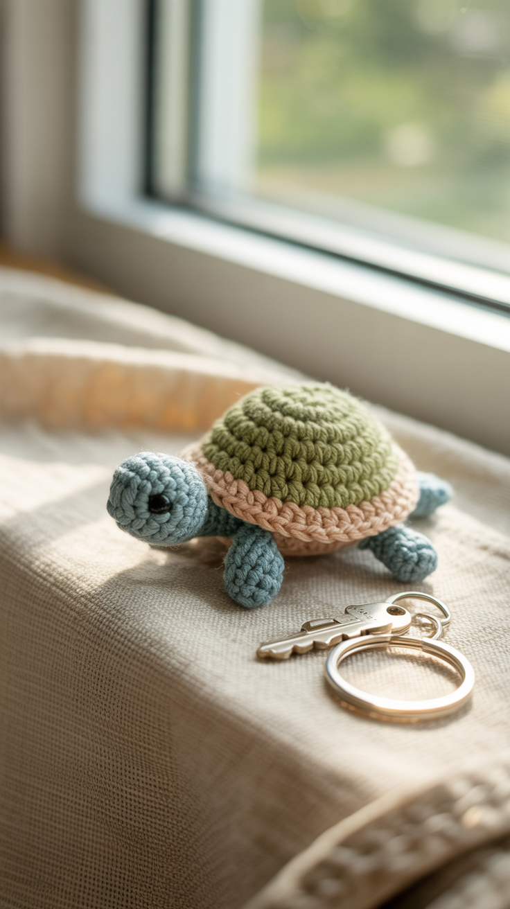 Ein Schlüsselanhänger in Schildkrötenform lässt sich schnell umsetzen. Er dient als persönliches Accessoire oder schmückt eine Geschenktüte. Du arbeitest nur wenige Reihen, sodass der Anhänger ideal für Zwischendurch ist.