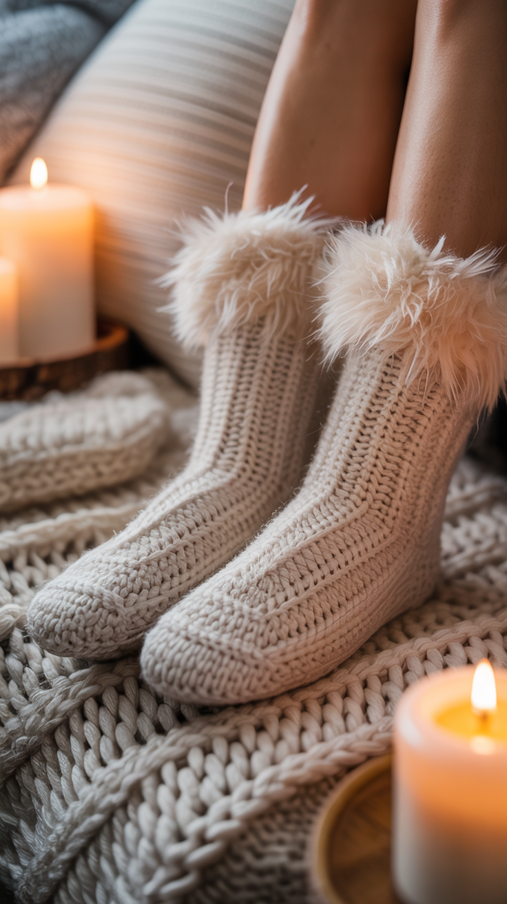Ein weiches Bündchen aus Flauschgarn verleiht Wärme und Komfort. Diese Version passt perfekt für kalte Tage und lädt zum Entspannen an kühlen Abenden ein. Das Flauschgarn bildet einen weichen Abschluss oberhalb des Fußrückens.