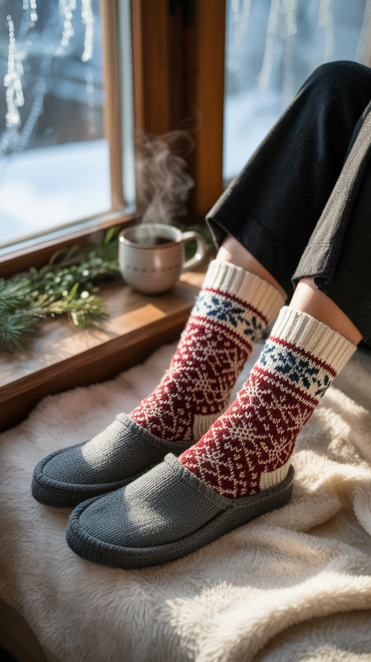 Klassische Norwegermuster schenken traditionelle Eleganz. Diese Socken passen zu Winterjacke und Wollmantel. Das zweifarbige Jacquardmuster erzeugt extra Dicke und Wärme.