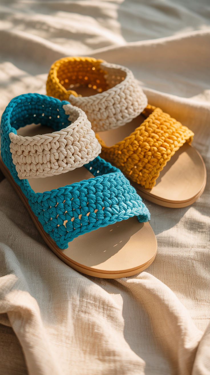 Wähle die Riemenlänge nach deinem Fußmaß. Durch Garn in Kontrastfarbe entsteht ein moderner Look. Nach dem Tragen einfach abspülen und an der Luft trocknen. Für mehr Halt knote die Riemchen am Ende.