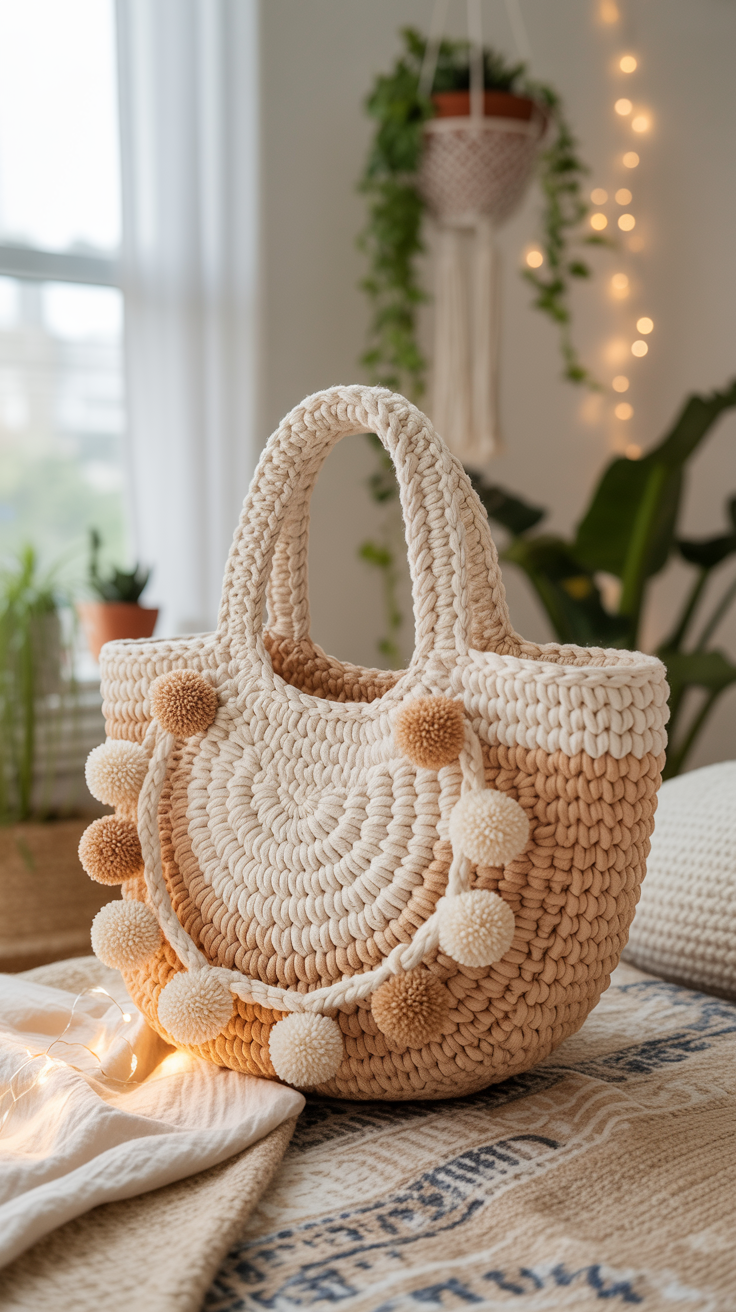 Die Bommeln geben dem Accessoire eine verspielte Note. Das grobe Garn unterstreicht den Boho-Stil. Innen ist genug Platz für Portemonnaie, Buch und Sonnenbrille.