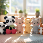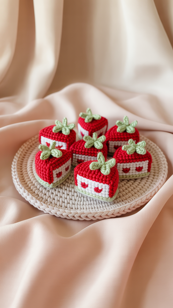 Mehrere Erdbeeren auf einem kleinen Teller lassen sich als Set häkeln. Die Anleitung zeigt, wie du mehrere Elemente verbindest. Das Set wirkt wie ein kleines Buffet.