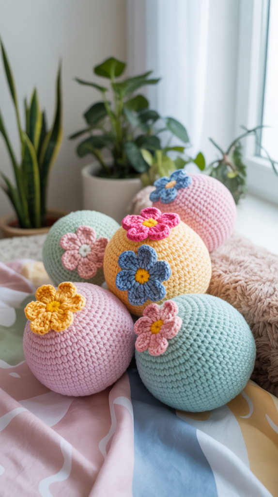 Eine Kugel mit aufgesetzten Blüten verbreitet Frühlingsstimmung im Haus. Die runde Form rollt nicht weg und bleibt als Türstopper liegen. Jede Blüte setzt einen farbigen Akzent.