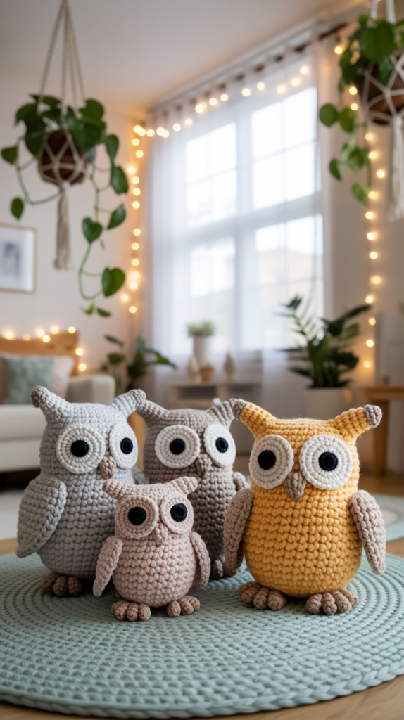 Platziere die Augen leicht versetzt, damit die Eule einen wachen Ausdruck bekommt. Spiele mit unterschiedlichen Garnstärken für mehr Tiefe. Ein einzelner Faden Glitzergarn kann einen auffälligen Blick erzeugen.