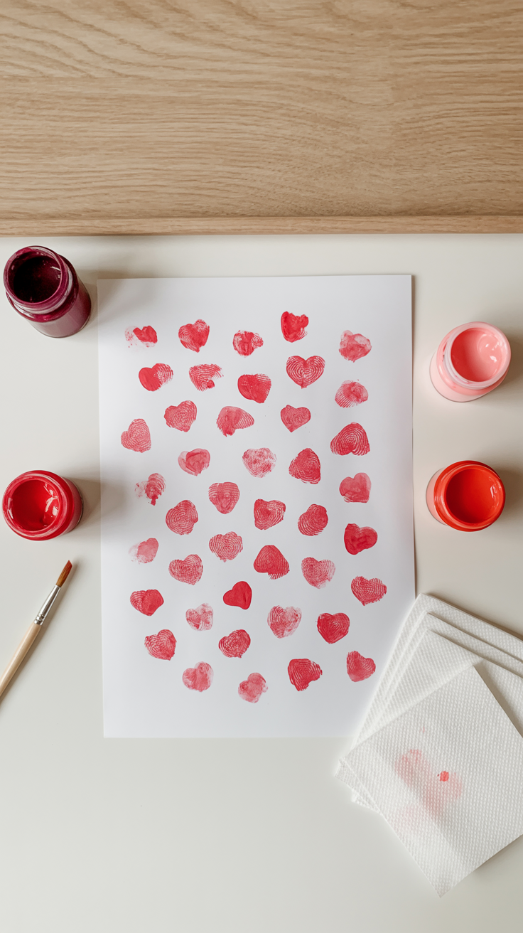 Kleine Finger, große Liebe! Diese Idee ist besonders für jüngere Kinder geeignet und wird zur süßen Erinnerung. Jeder Fingerabdruck wird zu einem kleinen Herz – einzigartig wie das Kind selbst.