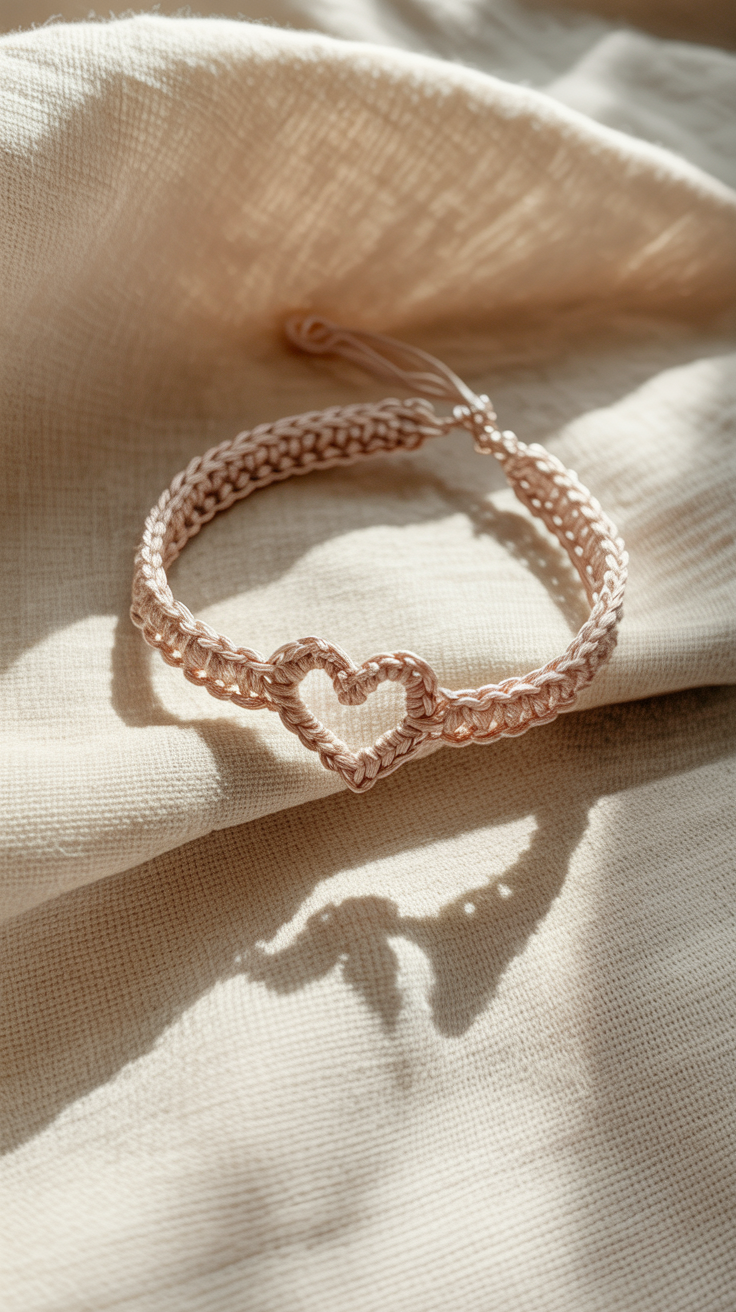 - Ordne die Herzen entlang der Kordel an und befestige sie mit Luftmaschen.