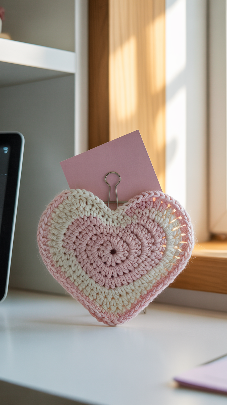 Ein Fotohalter mit Herz ist praktisch auf dem Schreibtisch. Das Foto wird mit einer kleinen Metallklammer gehalten. Das Herz dient als dekorative Basis.
