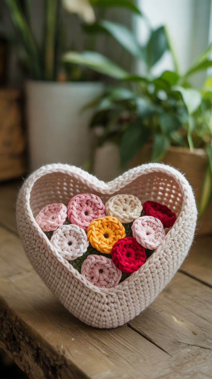 Eine Schale in Herzform bietet Platz für kleine Häkelblumen. Sie kann auf dem Tisch stehen und ist wiederverwendbar. Die Blumen lassen sich austauschen.