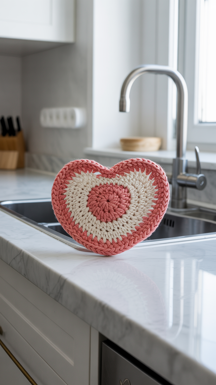Ein Spülschwamm aus Baumwolle ist praktisch und nachhaltig. Die Herzform liegt gut in der Hand. Er ist maschinenwaschbar und langlebig.