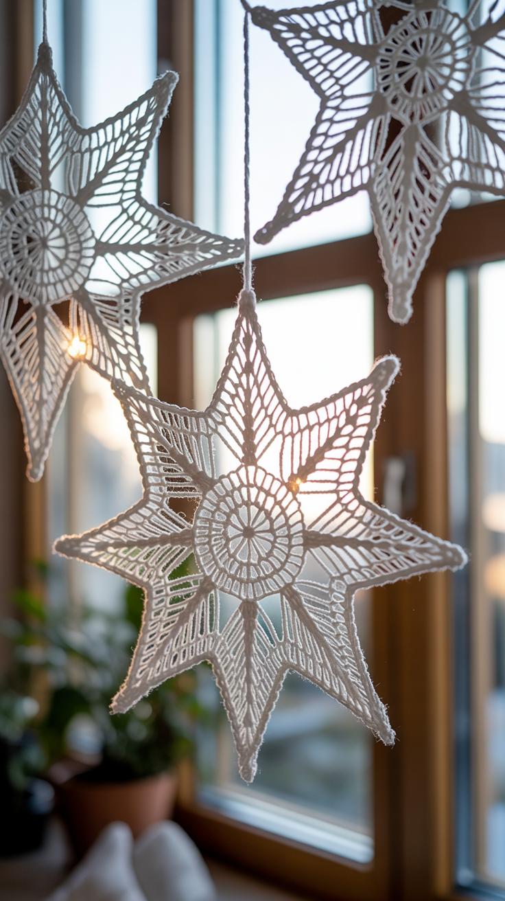 Fenstersterne aus Häkelgarn bringen winterliche Stimmung ins Zimmer. Sie bestehen aus feinen Spitzen und lassen Licht sanft hindurch. Im Fensterrahmen wirken sie fast wie Eiskristalle.