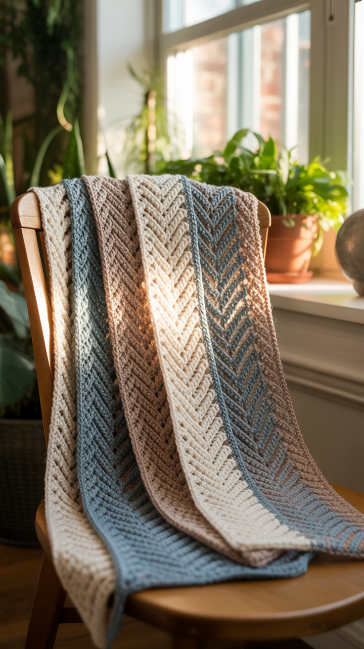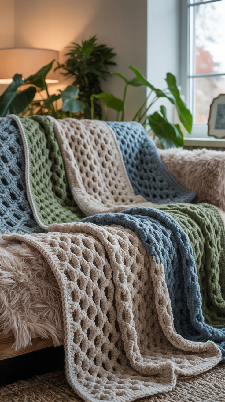 Ein Deckenwärmer in Winterfarben bringt Gemütlichkeit ins Wohnzimmer. Das Muster aus Waben oder Zöpfen bietet Struktur und Wärme. Ideal zum Einkuscheln beim Lesen oder Fernsehen.