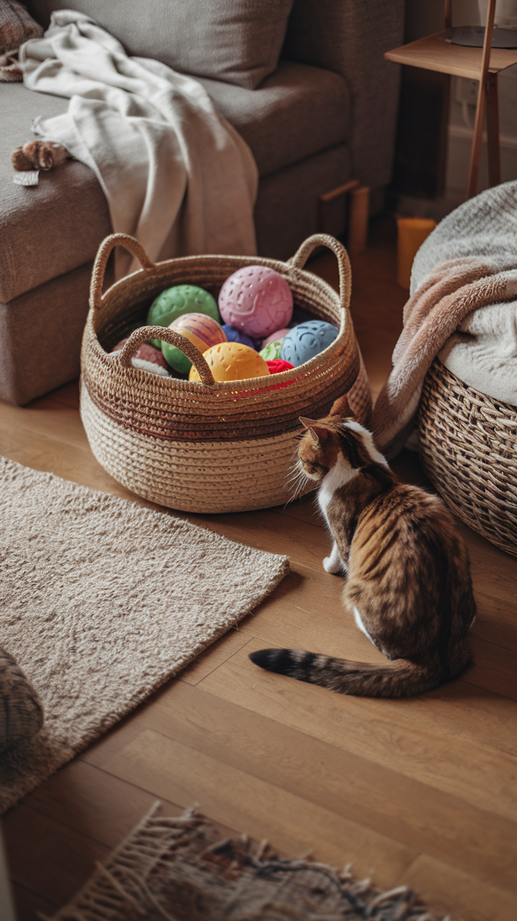 Das Problem ist nicht das Spielzeug, sondern die Ordnung. Ein Korb aus Rattan, eine kleine Box aus Holz oder einfach eine hübsche Schublade. Schon wirkt es viel ordentlicher. Und die Katze findet ihr Spielzeug trotzdem, weil du es griffbereit hast.