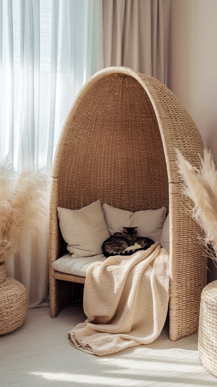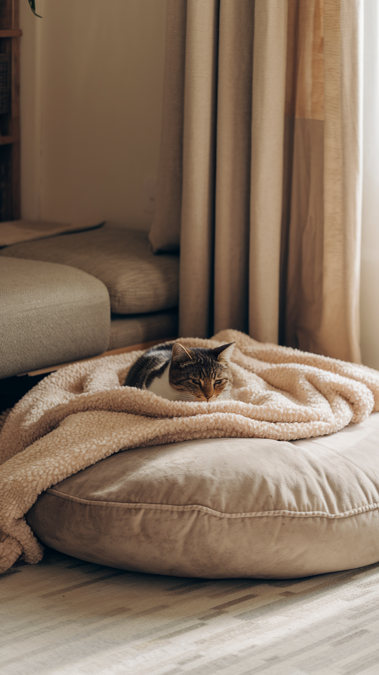 Klar, Katzen haben ihre eigenen Plätze. Aber sie lieben es auch, bei dir zu liegen. Also bau euch Kuschelecken, die ihr teilen könnt. Ein großer Pouf, eine Decke auf der Couch, ein Kissenstuhl.