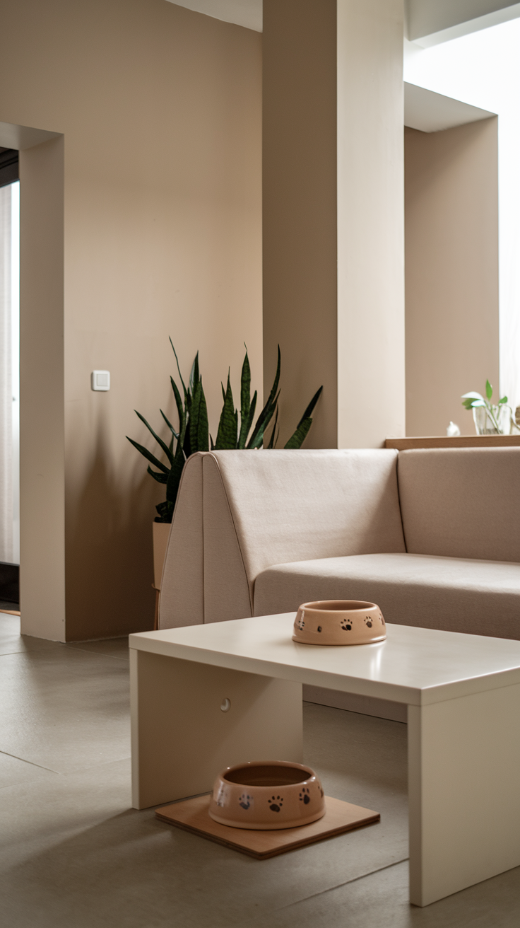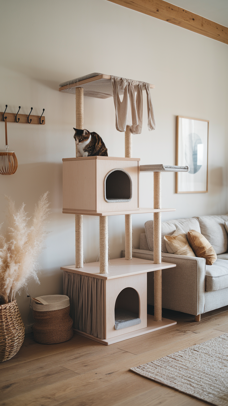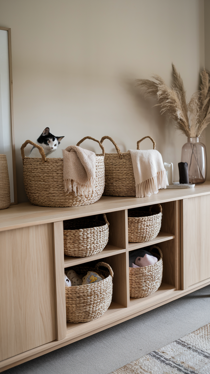 Katzen bringen immer Chaos. Spielzeug, Decken, Kratzreste. Aber du kannst viel mit Aufbewahrung machen. Körbe, geschlossene Regale, Sideboards. Alles hat seinen Platz, trotzdem bleibt es wohnlich.